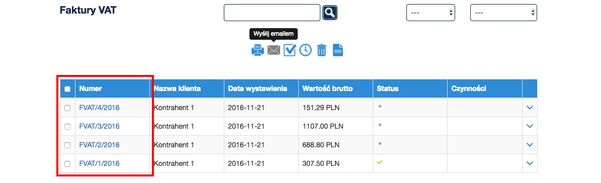 Aby dokonać np. wysłania e-mailem wielu faktur, wybierz dokumenty i kliknij na ikonę nad listą.