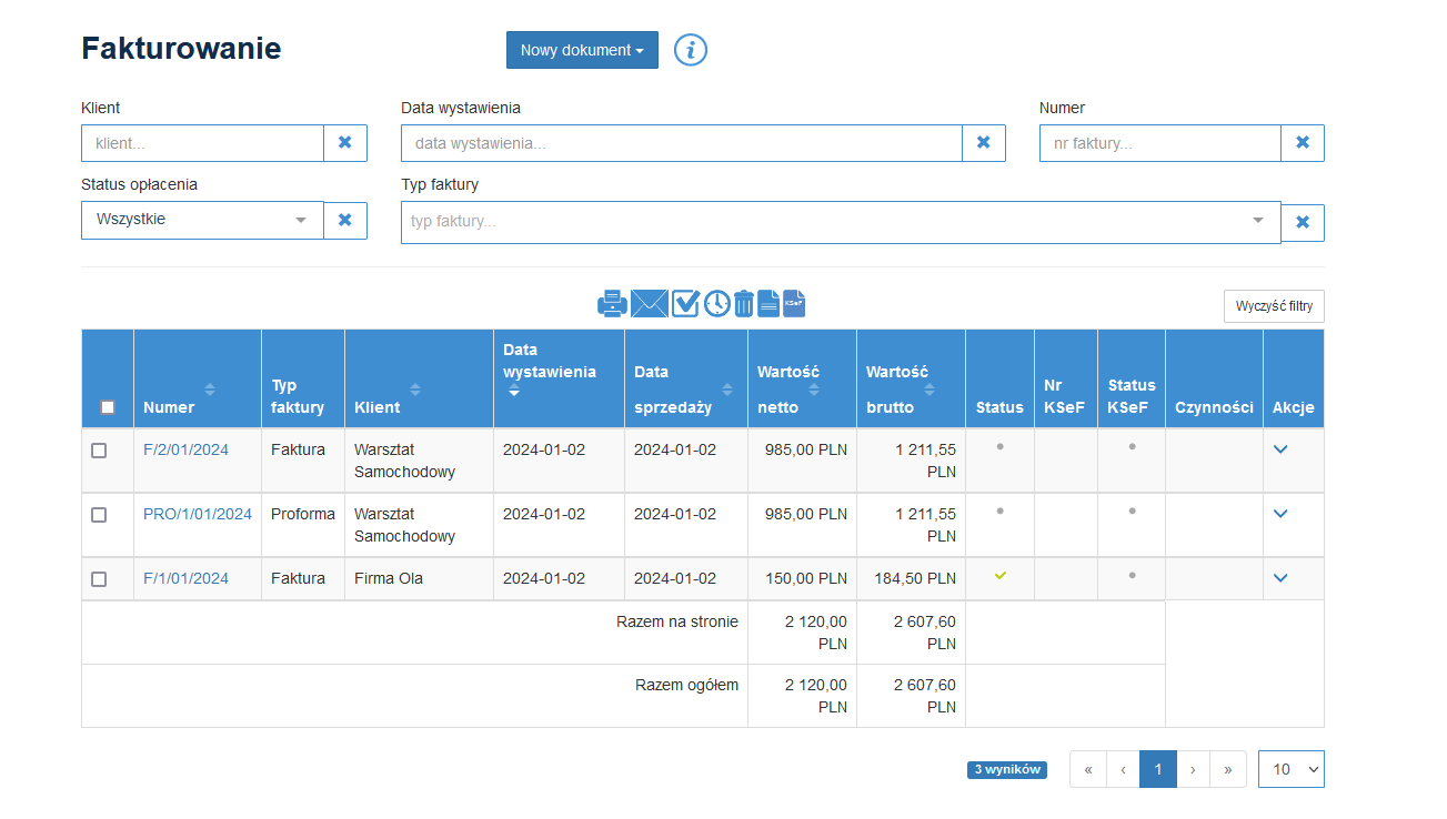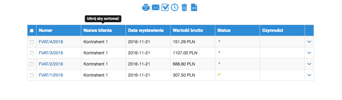 Jest to lista wystawionych dokumentów, z możliwością wystawiania kolejnych, modyfikacji, drukowania, wysyłania e-mailem i oznaczania opłacenia. Dla Twojej wygody na bieżąco wyświetlana jest informacja o statusie opłacenia faktury oraz czynnościach na nich dokonanych (np. wydrukowania, wysłania e-mailem).