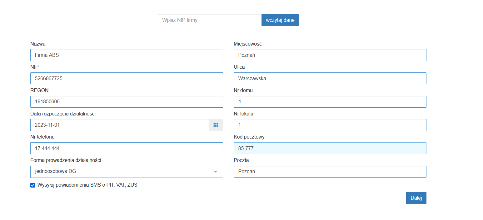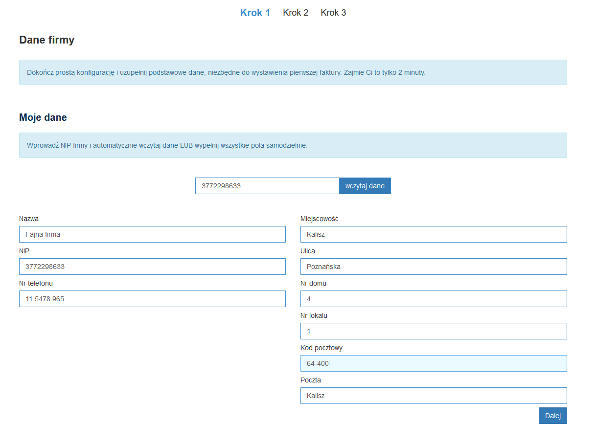 Dane możesz uzupełnić ręcznie lub pobrać wpisując NIP i wybierając przycisk “Pobierz dane”.