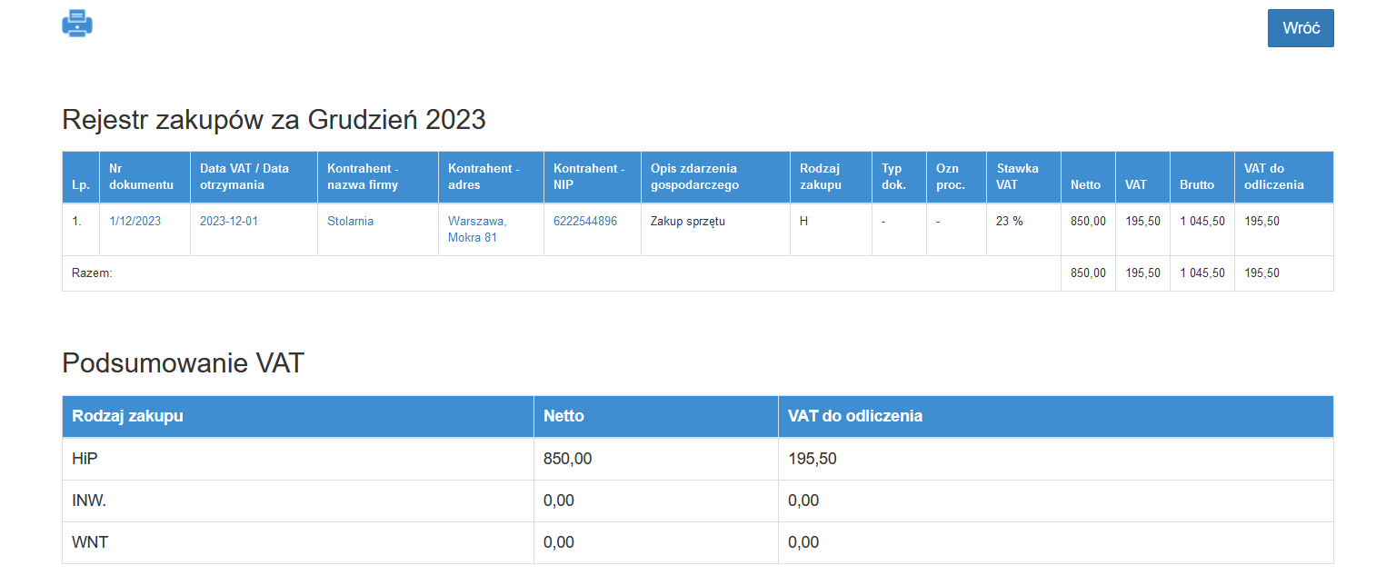 W rejestrze znajdują się dokumenty zakupu, które zostały wprowadzone z poziomu wpisów. Zawiera dane według kolumn wraz z podsumowaniem, rejestr można wydrukować. W dziale rejestru zakupu znajduje się wygodne podsumowanie z podziałem na dokumenty: handlowe, inwestycyjne i pozostałe.