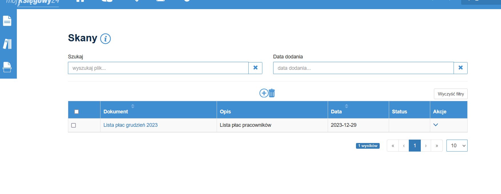 Funkcjonalność skanów pozwala na dodanie plików skanowanych na innym urządzeniu na przykład na telefonie, dodania opisu dokumentu, przypisania daty. Dokument może zostać pobrany przez inną osobę z oznaczeniem daty pobrania.