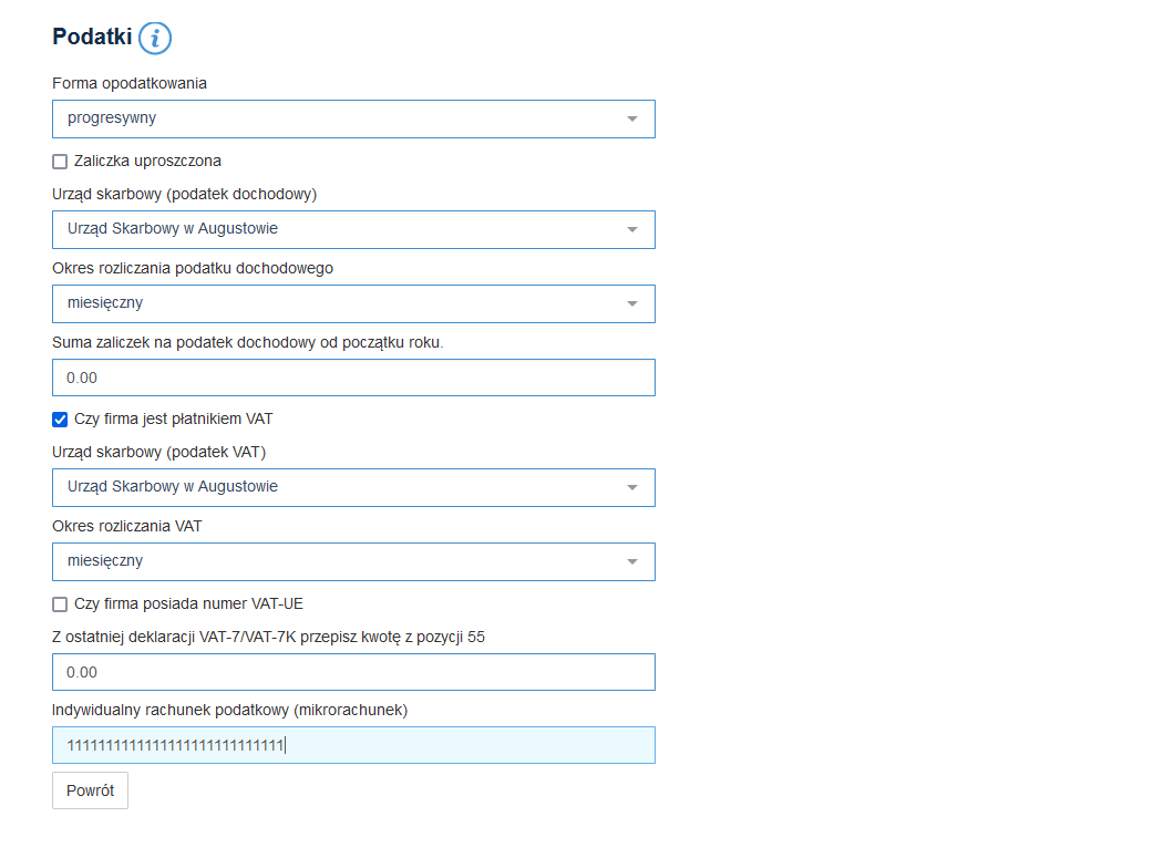 W kolejnym kroku trzecim, wypełnij dane podatkowe. Wybierz urząd skarbowy, podaj okres rozliczania z VAT, a także indywidualny rachunek podatkowy - mikrorachunek.