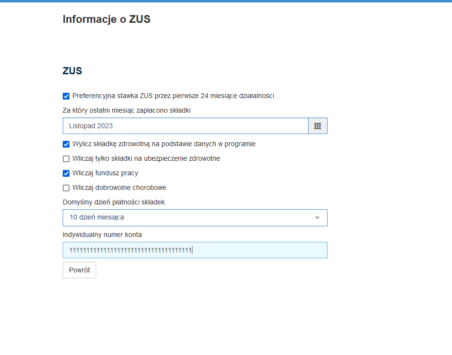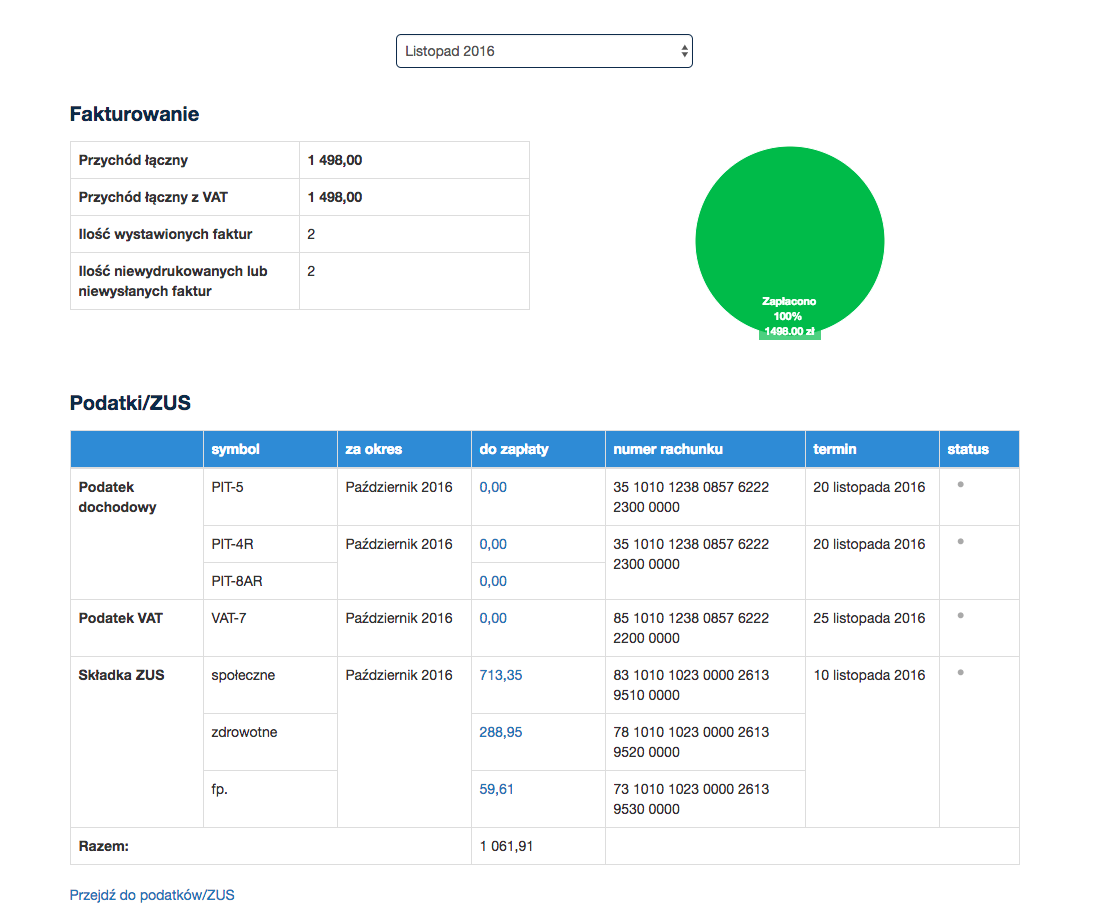 - podatków/ZUS (wysokości składek, numeru rachunku wpłaty, terminów i statusów opłacenia),