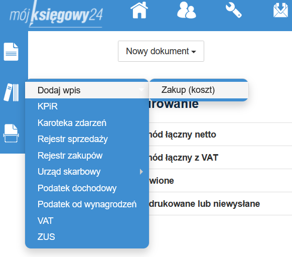W celu zarejestrowania faktur kosztowych, skorzystaj z opcji dodania wpisu, wybierz z menu Księgowość - > Dodawanie wpisów.
