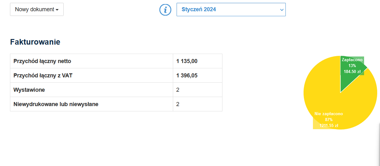 Okno główne wskazuje podsumowanie fakturowania, tj: przychody, ilości dokumentów i status ich opłacenia w miesiącu.
