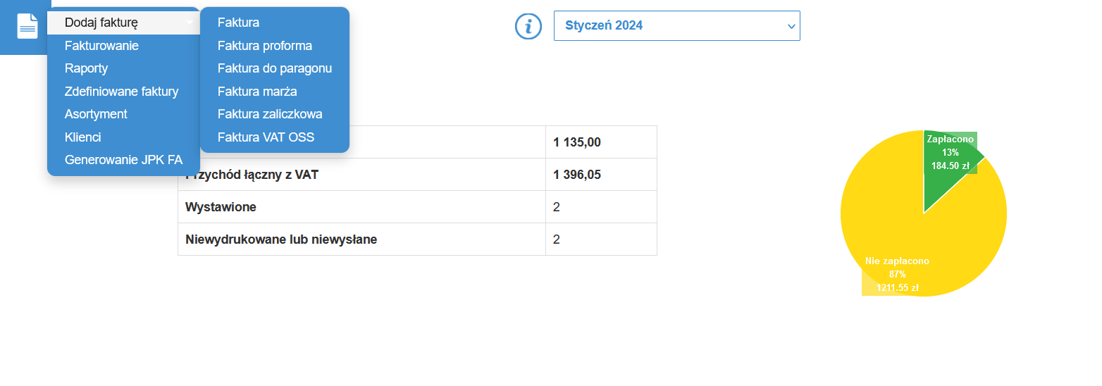 Możesz także wybrać opcję przejścia do pełnej części modułu klikając w ikonę "fakturowania" w menu znajdującym się po lewej stronie, który zawiera: zarządzanie fakturami, możliwość tworzenia zdefiniowanych faktur, a także tworzenie słowników klientów i produktów.