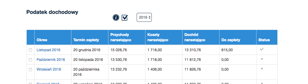 Szary haczyk w kolumnie status w zakładkach podatek dochodowy oraz