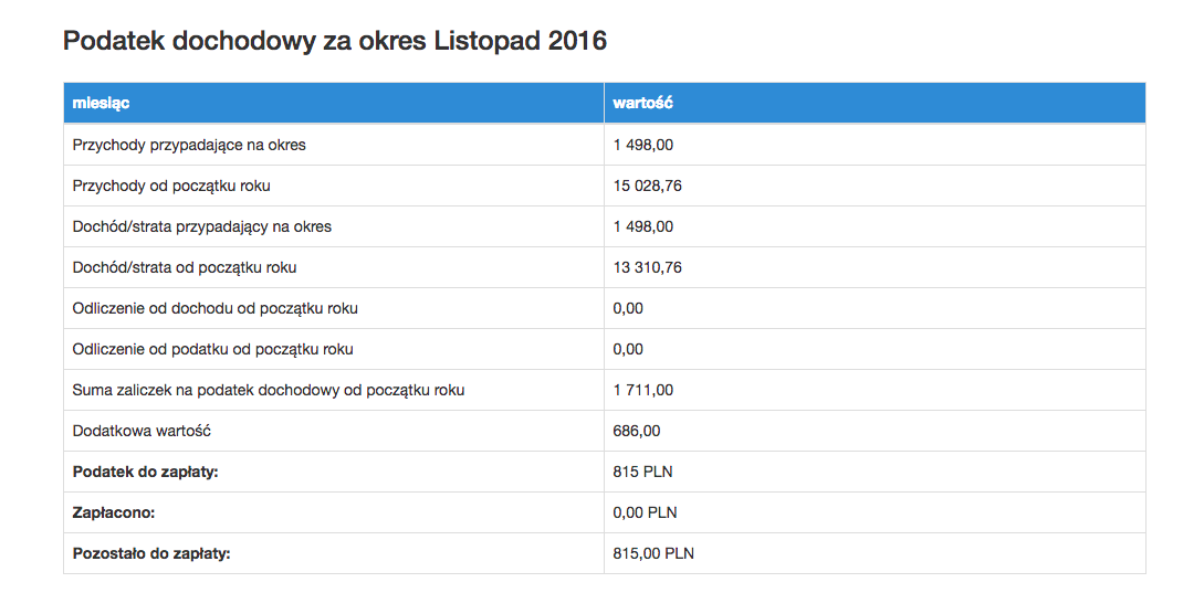 Po kliknięciu w poszczególny miesiąc pojawią się wszystkie szczegółowe informacje dotyczące podatku dochodowego tego okresu.